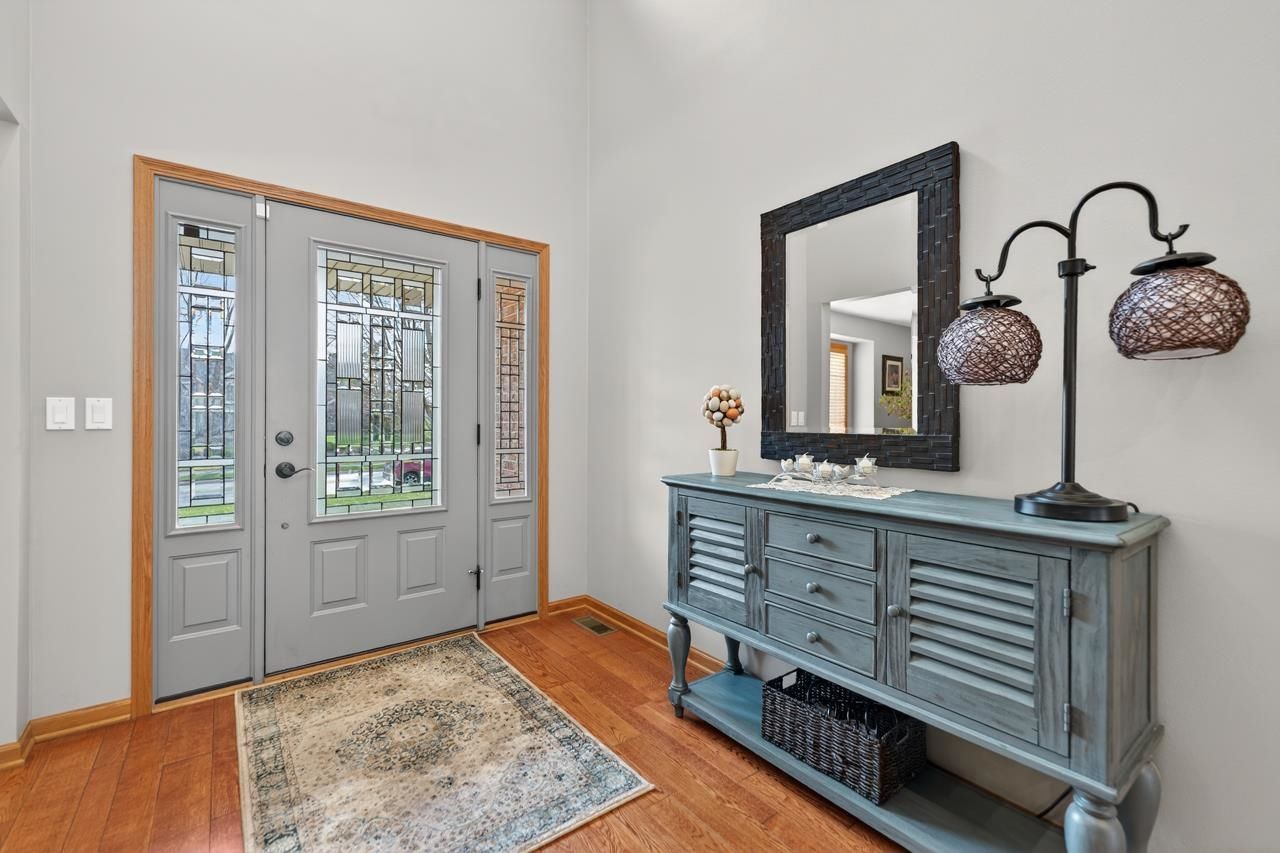 Welcome to this stunning Zimmerman built executive home offering over 4,500 square feet of beautifully finished living space, set within a private, wooded backdrop that delivers both serenity and convenience. From the moment you enter, you are greeted by soaring ceilings and a dramatic two story great room filled with natural light, creating an inviting yet refined atmosphere. The main level primary suite offers comfort and privacy, while the open concept design seamlessly connects the living space to a well appointed kitchen featuring generous workspace, a large pantry, and effortless flow for entertaining. Upstairs, a lofted overlook adds architectural interest and flexibility, accompanied by three spacious bedrooms designed for comfort and function. The finished lower level is an entertainer's dream, complete with a large family room, bar area, recreation space, full bath, and additional office or flex room ideal for hosting, working from home, or accommodating guests. Step outside to a beautifully crafted stamped concrete patio with awning, perfect for relaxing evenings or entertaining in style. Surrounded by mature trees, the setting offers a sense of privacy rarely found while still being just minutes from I-90, healthcare facilities, and premier local amenities. This home combines timeless design, generous space, and an ideal location perfect for those seeking both comfort and elevated living. Please independently verify all information, including room sizes, square footage, and location details.